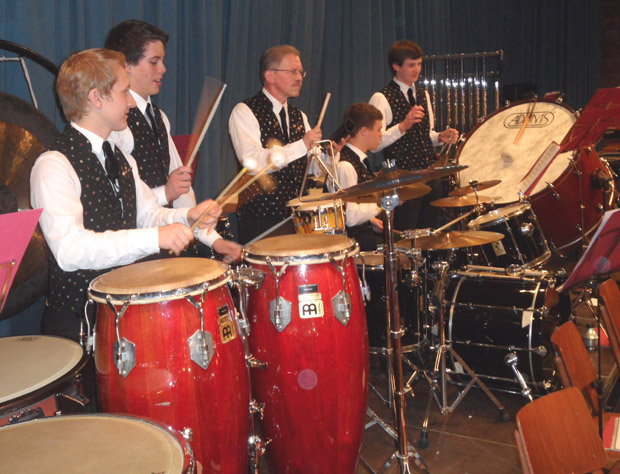 Die 5 Schlagzeuger Julian Laages (von links), Maximilian Faller, Manfred Duffner, Sefan Kammerer und Peter Landtrachtinger zeigten was sie können und legten eine effektvolle Solonummer hin, welche das Publikum zu stürmischen Bravo Rufen animierte.