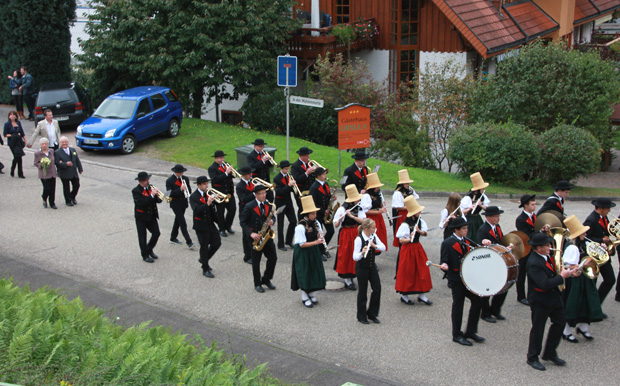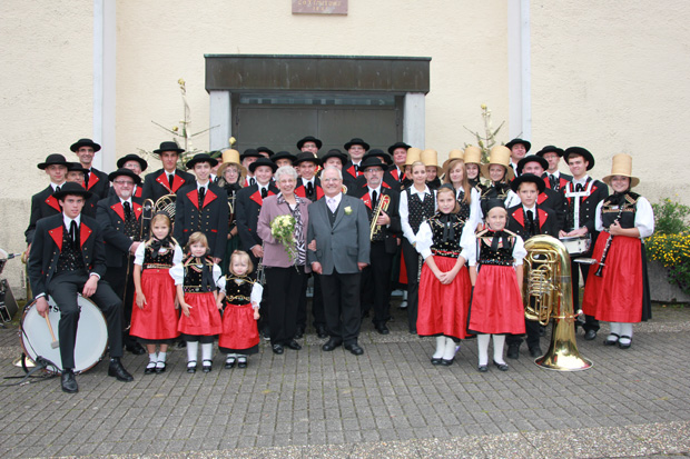 Die Trachtenkapelle zog mit Marschmusik zum Wohnhaus der Jubilare am Eichbühl. Die Musikerinnen und Musiker wurden zu einem Umtrunk eingeladen, für den wir uns herzlich bedanken.