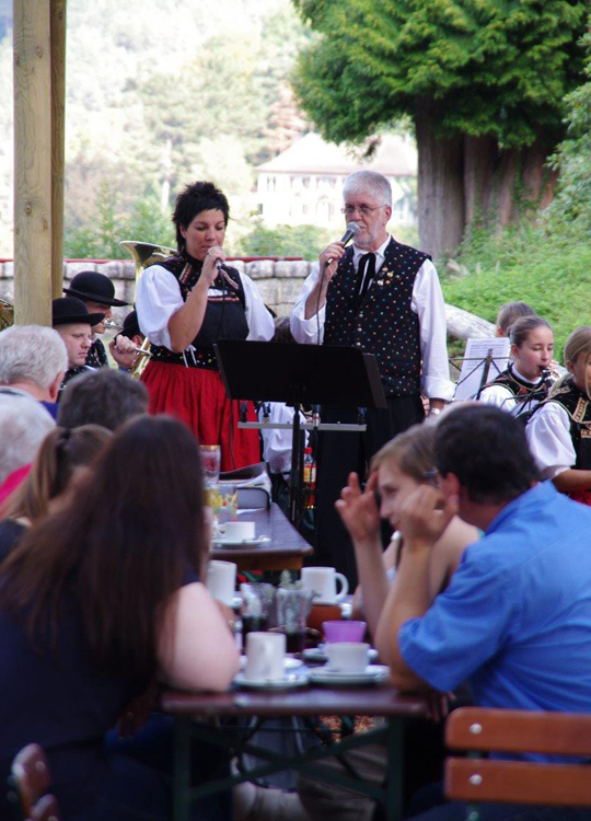 Unter der Leitung von Thomas Scheiflinger präsentierte sich die Kapelle in der Schwarzwälder Tracht im Biergarten des Hotels Schloss Hornberg einem erfreulich großen Publikum. Die Besucher genossen die Musikstücke bei Sonnenschein, sie genossen aber auch den Wirtschaftsbetrieb des Hotels und die tolle Aussicht auf Hornberg und weit hinein ins Gutachtal.