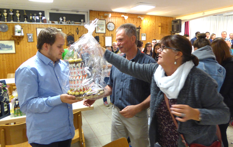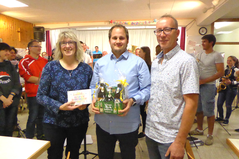 Die Vorsitzende Claudia Lauble-Plewa und der Vize Rupert Kienzler gratulierten Thomas im Namen des Vereins und überreichten neben Getränken auch einen Gutschein.