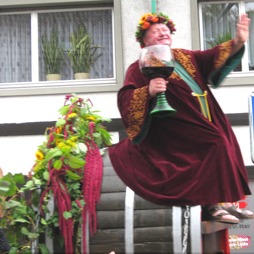Weingott Bacchus mit riesigem Weinrömer auf einem großen Holzfass und weitere herrliche Festwagen in einem Meer von Blumen und Farben waren wunderschöne Bereicherungen des Umzuges.