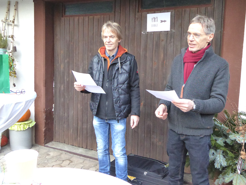 Alle Gäste wurden von den beiden Geburtstagskindern Karl-Georg (links) und Hubert in einer launigen Ansprache willkommen geheißen.
